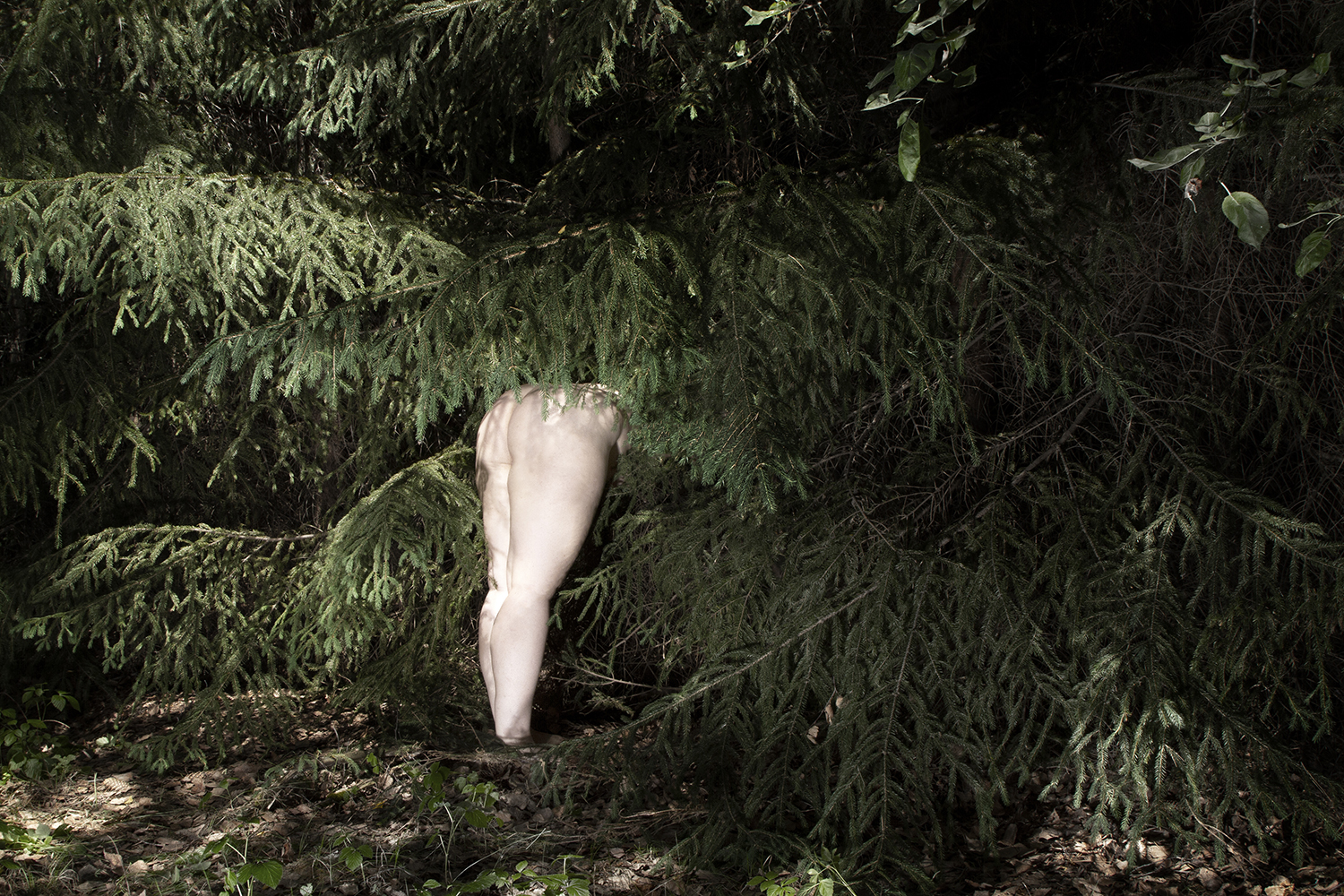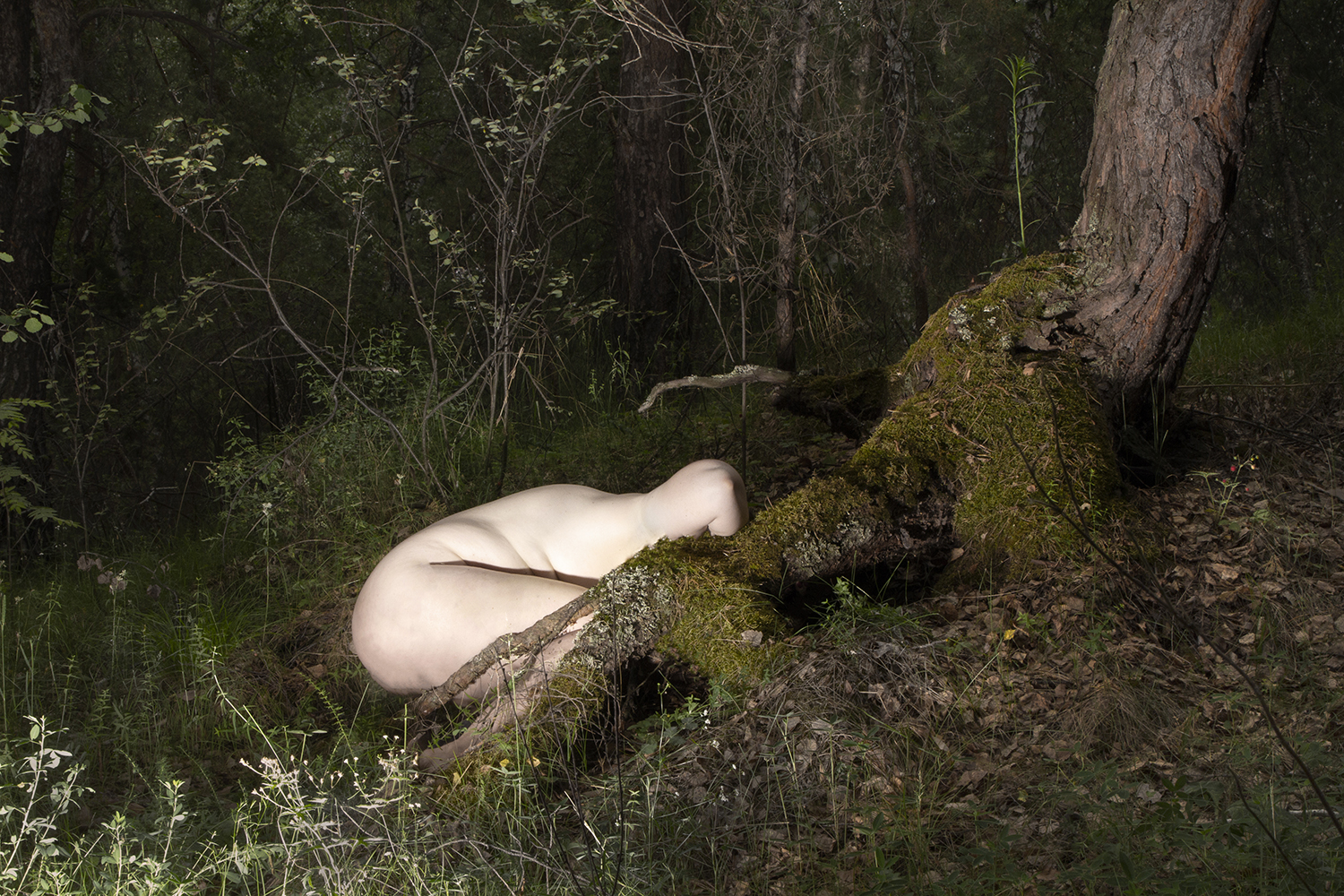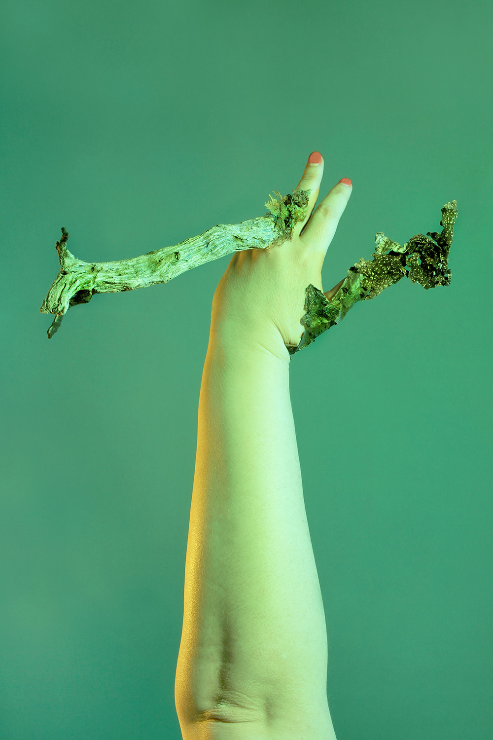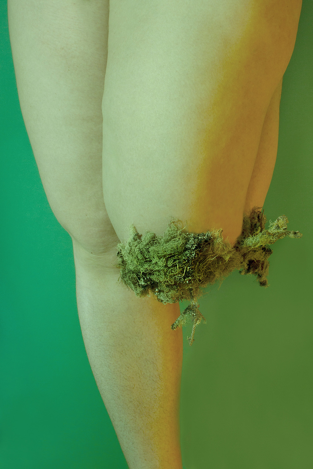 Starting from the image of Daphne turning into a laurel tree, Anastasia Bogomolova moves ancient plot to the world existing at the stage of cultural and natural half-life. In "Assemblage" the conventional figure of the nymph becomes the embodiment of an obsessive state to escape into the forest – a place that is mistakenly perceived to be abandoned but turns out to be the ruins of civilization, where unpredictable intraspecific contacts take place. Visually, the project is divided into two parts. In the first, the artist explores forest landscapes next to well-trodden paths, which look wildly in the images. In photographic performances there the human body is subordinated to the logic of a forest or bushes. The second part, created in the studio, utilizes natural materials. Collected in various ecological niches, they combined into assemblages on the human body — possible or unattainable ones. Dry branches seem to be new limbs, lichens and mosses grow through the skin, rough bark tightens the injuries. Illuminated with bright contrasting colours, these hybrids look like jewellery pieces or futuristic modifications of a body striving to move beyond the dichotomy of nature and culture.