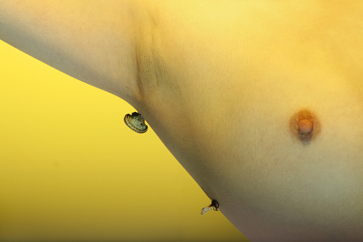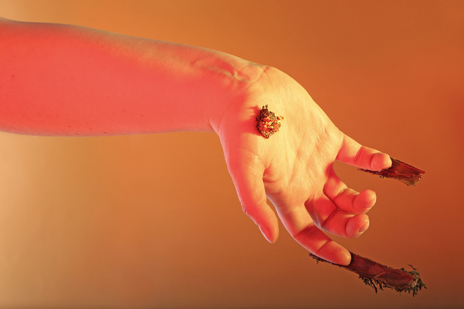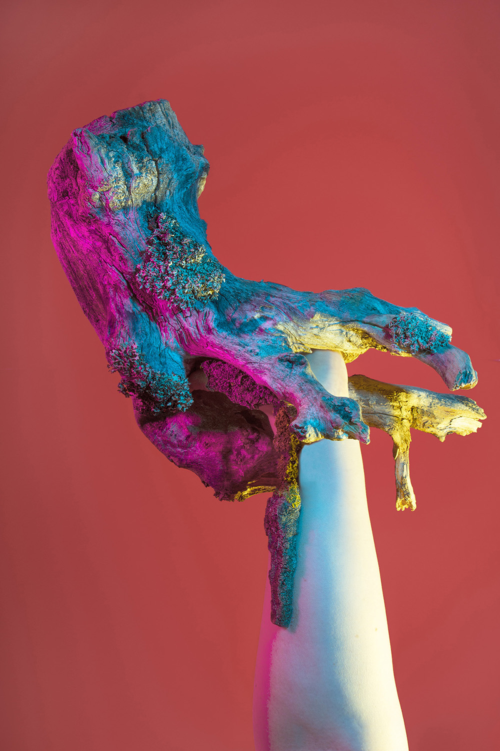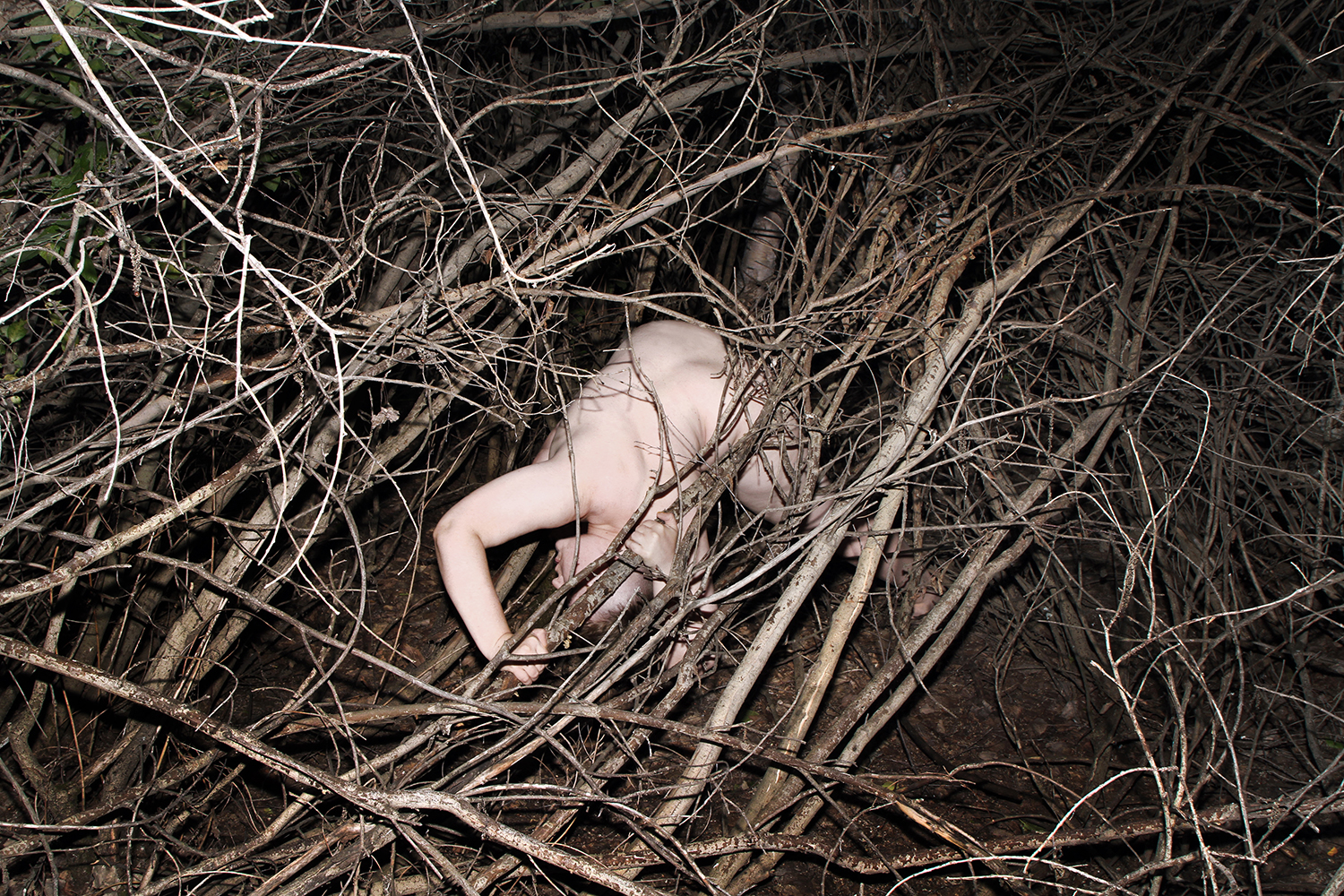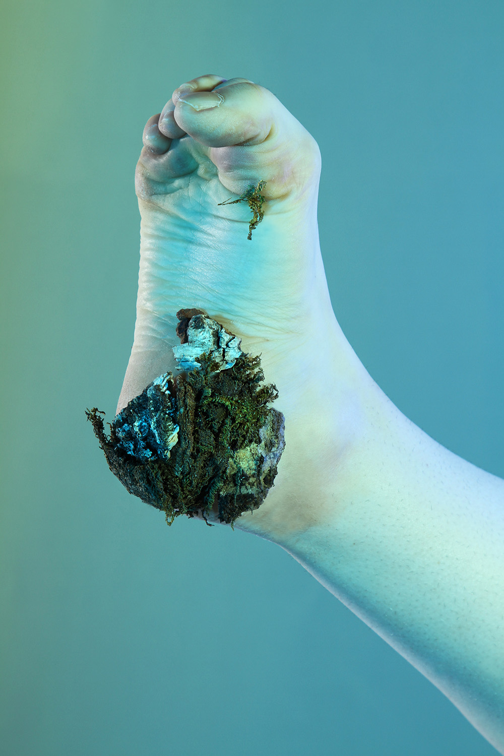 Starting from the image of Daphne turning into a laurel tree, Anastasia Bogomolova moves ancient plot to the world existing at the stage of cultural and natural half-life. In "Assemblage" the conventional figure of the nymph becomes the embodiment of an obsessive state to escape into the forest – a place that is mistakenly perceived to be abandoned but turns out to be the ruins of civilization, where unpredictable intraspecific contacts take place. Visually, the project is divided into two parts. In the first, the artist explores forest landscapes next to well-trodden paths, which look wildly in the images. In photographic performances there the human body is subordinated to the logic of a forest or bushes. The second part, created in the studio, utilizes natural materials. Collected in various ecological niches, they combined into assemblages on the human body — possible or unattainable ones. Dry branches seem to be new limbs, lichens and mosses grow through the skin, rough bark tightens the injuries. Illuminated with bright contrasting colours, these hybrids look like jewellery pieces or futuristic modifications of a body striving to move beyond the dichotomy of nature and culture.