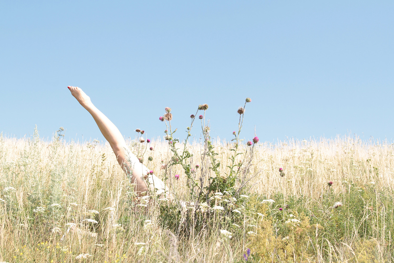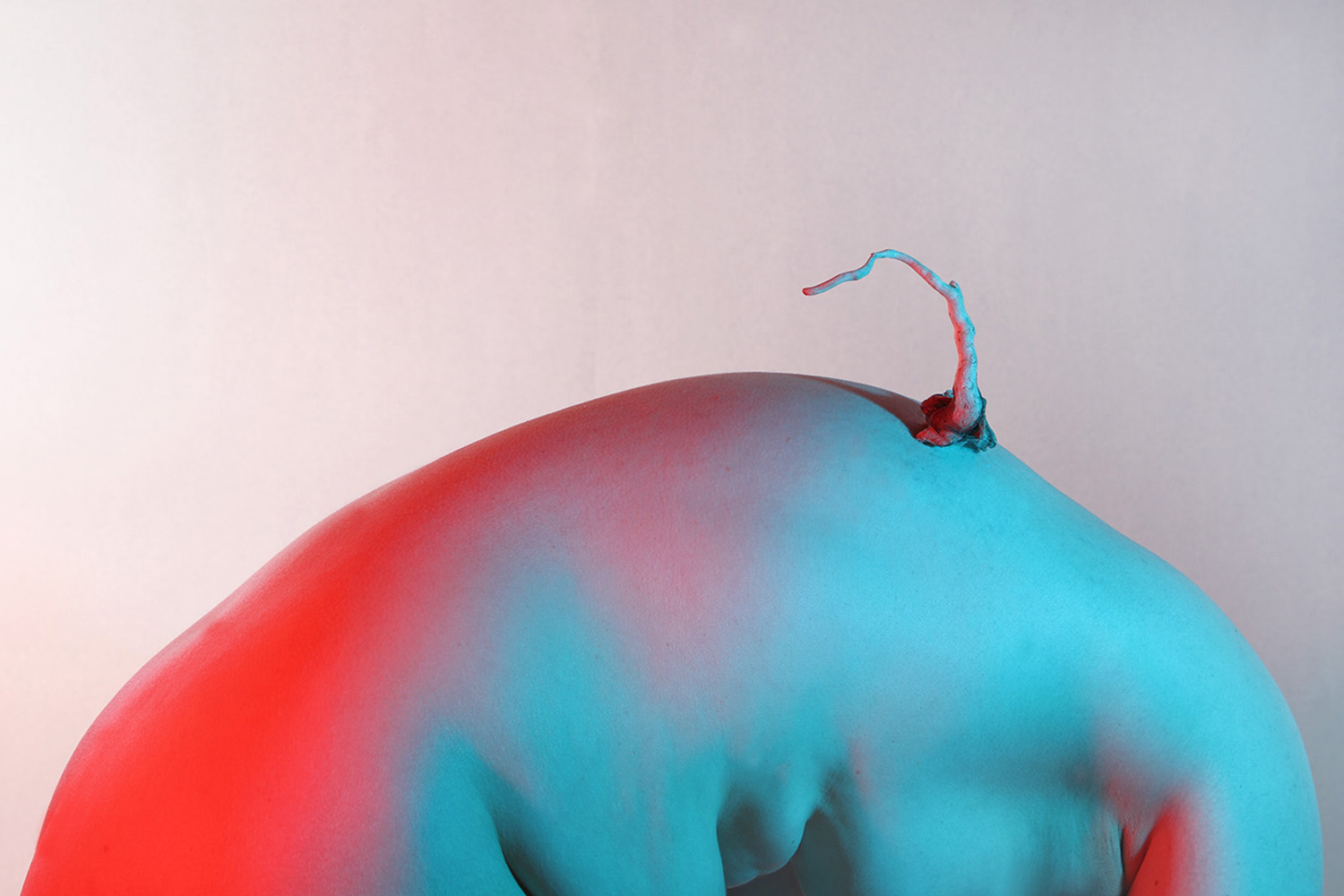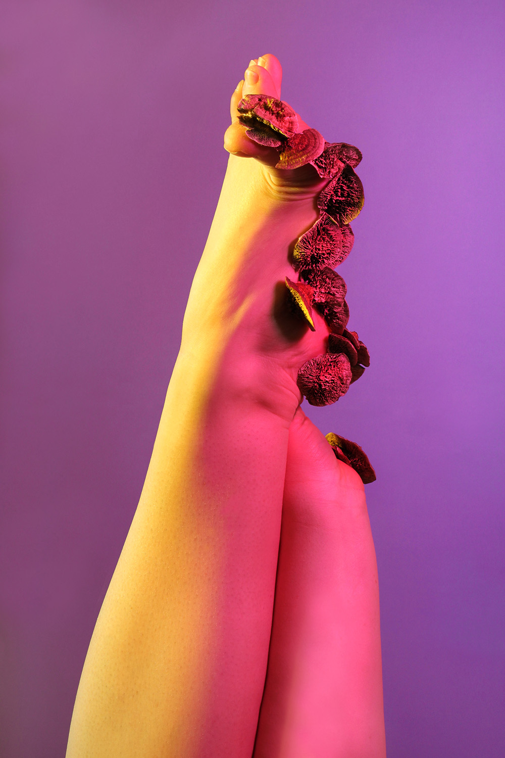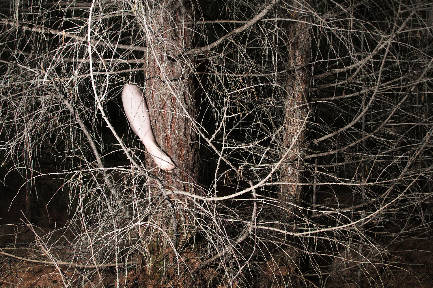 Starting from the image of Daphne turning into a laurel tree, Anastasia Bogomolova moves ancient plot to the world existing at the stage of cultural and natural half-life. In "Assemblage" the conventional figure of the nymph becomes the embodiment of an obsessive state to escape into the forest – a place that is mistakenly perceived to be abandoned but turns out to be the ruins of civilization, where unpredictable intraspecific contacts take place. Visually, the project is divided into two parts. In the first, the artist explores forest landscapes next to well-trodden paths, which look wildly in the images. In photographic performances there the human body is subordinated to the logic of a forest or bushes. The second part, created in the studio, utilizes natural materials. Collected in various ecological niches, they combined into assemblages on the human body — possible or unattainable ones. Dry branches seem to be new limbs, lichens and mosses grow through the skin, rough bark tightens the injuries. Illuminated with bright contrasting colours, these hybrids look like jewellery pieces or futuristic modifications of a body striving to move beyond the dichotomy of nature and culture.