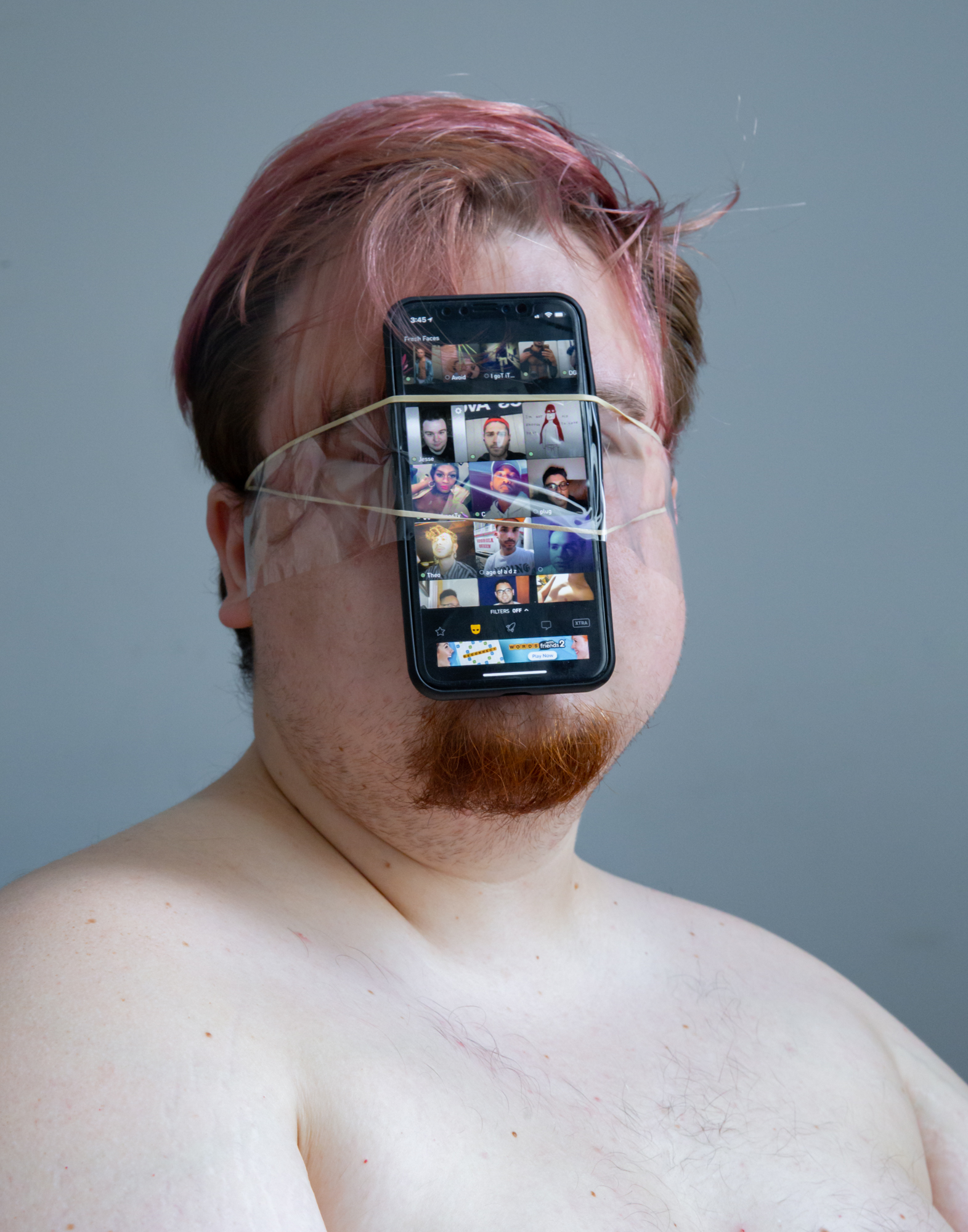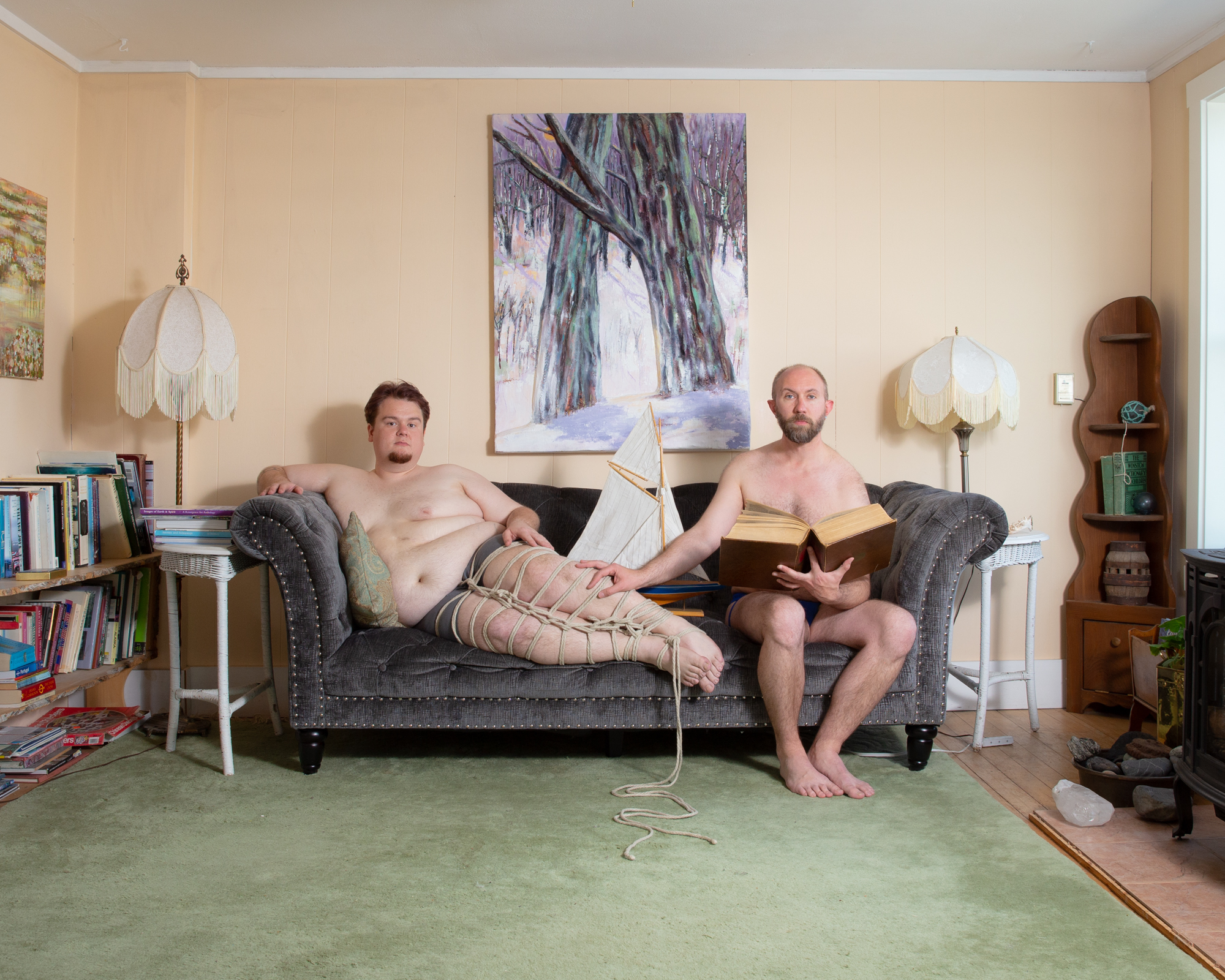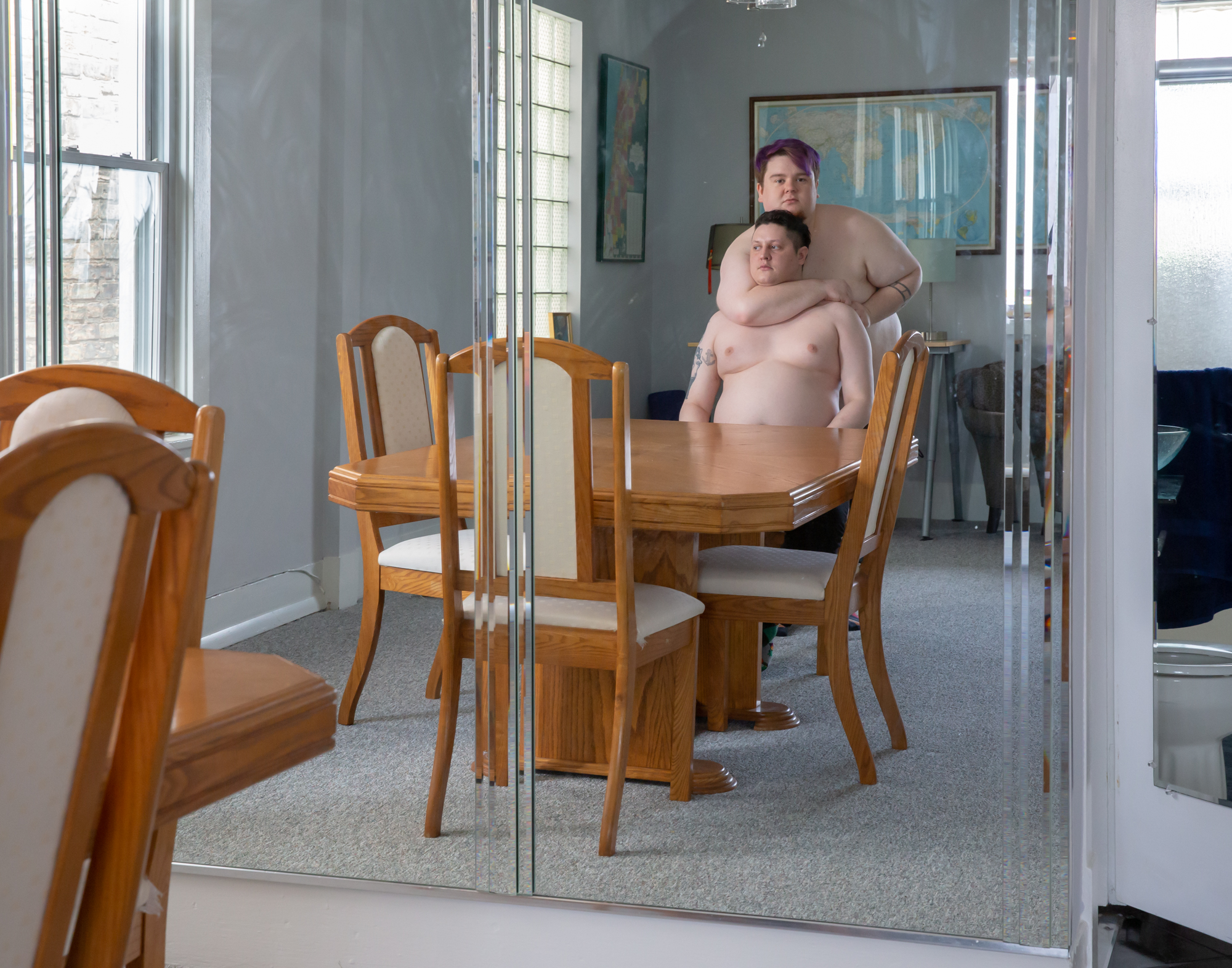 “No Femmes. No Fats.” When I started using gay dating apps as a teen, I saw this phrase frequently. As a fat queer person, this rejection from my peers set in motion a battle between my queerness and my body. This series began with self-portraiture exploring queerness through absurdity, humor, and play. Soon after, collaboration became an integral part of my work, with me often appearing in the photographs with others. The photographs are mostly taken in the individuals’ homes or other spaces they are comfortable in, and we utilize materials from their environment. This collaboration begins to break down the power dynamics that can exist between photographer and subject, as well as embody the camaraderie and companionship of queer communities and relationships. These photographs not only establish a space of queer collaboration and play, but also offer a counter narrative to the normative sexualized gaze of contemporary queer photography. My photographs do not offer concrete narratives of identity. Rather, they present fragmented narratives that exist in-between reality and fantasy, reflecting the transitional space in which queerness exists. When I take photographs, the process is spontaneous—not unlike the practice of freeassociation—and echos the dynamism of non-normative queer identities.