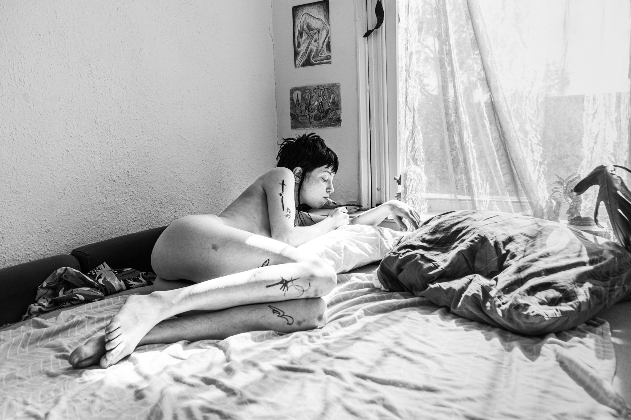 Bedrooms become shrines, bodies become canvases of identity and resistance, and fleeting moments — a tattoo, a cigarette, a shared night swim — carry the weight of belonging.